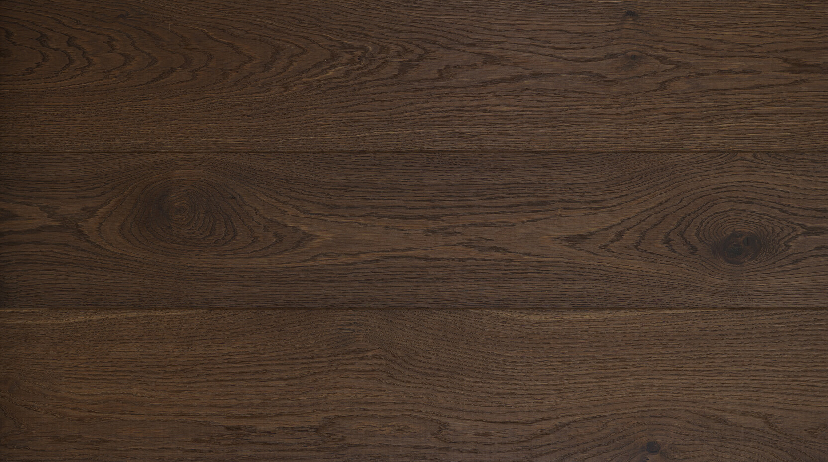 This board has a dark brown tone with black pigment in the grain created by the longer or 'double' fuming process and ebony oil finish.