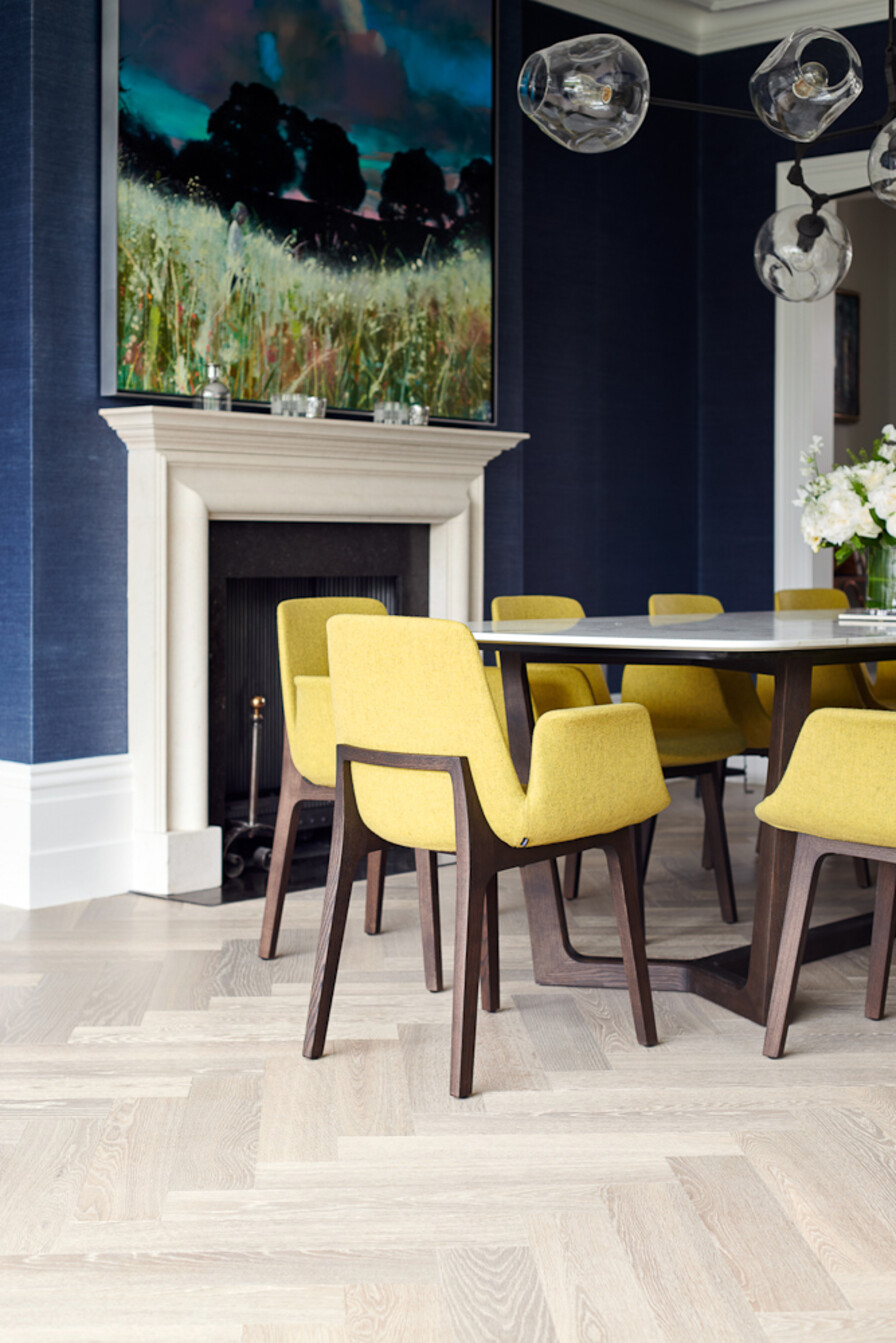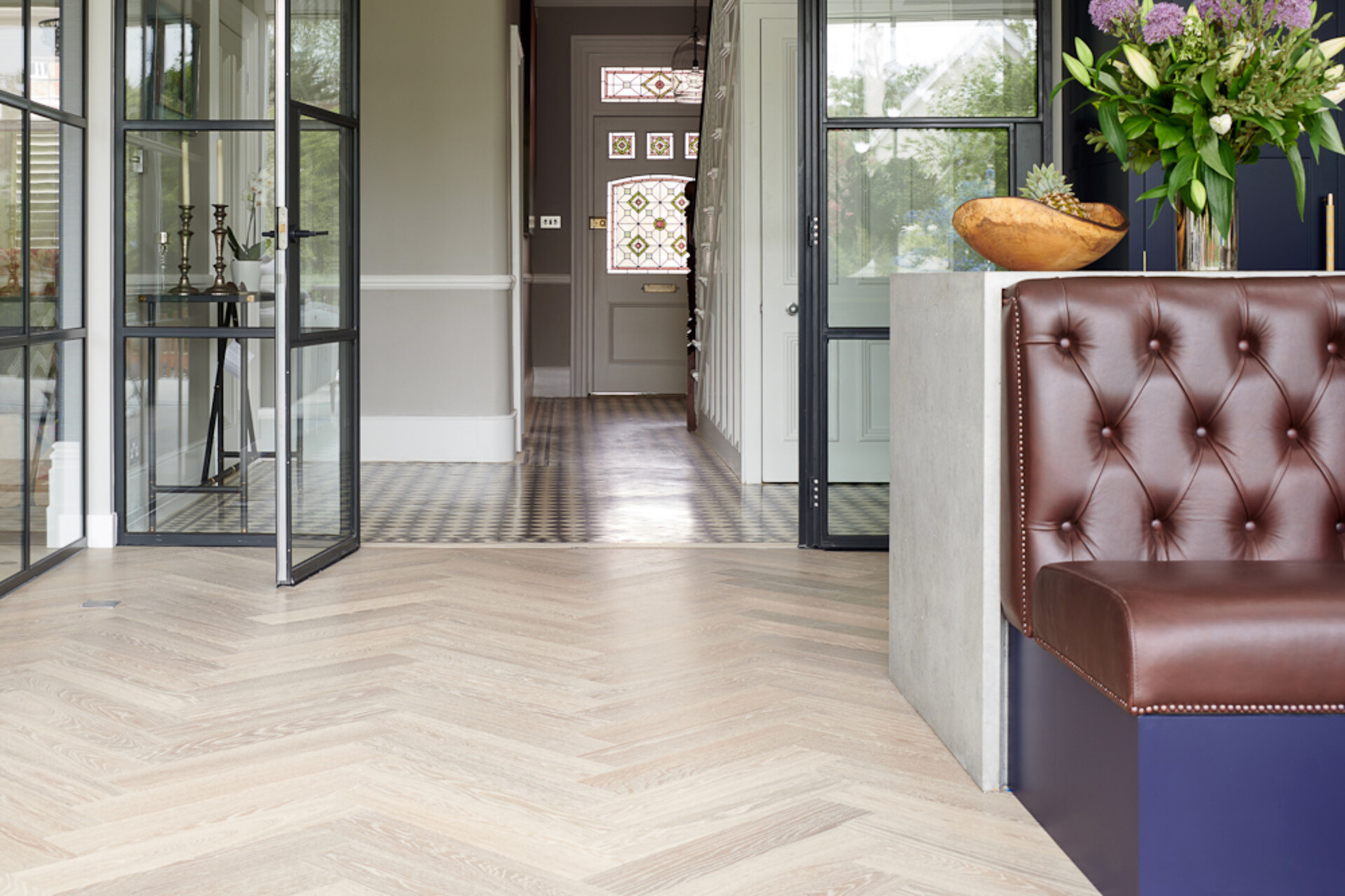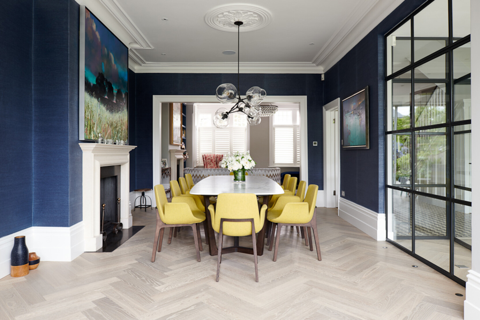 Two tones of prime grade Oak Shingle Herringbone parquet flooring complement the bold colours, high skirting and glass-panelled doors, helping to spread the light throughout the ground floor of this large Victorian house.