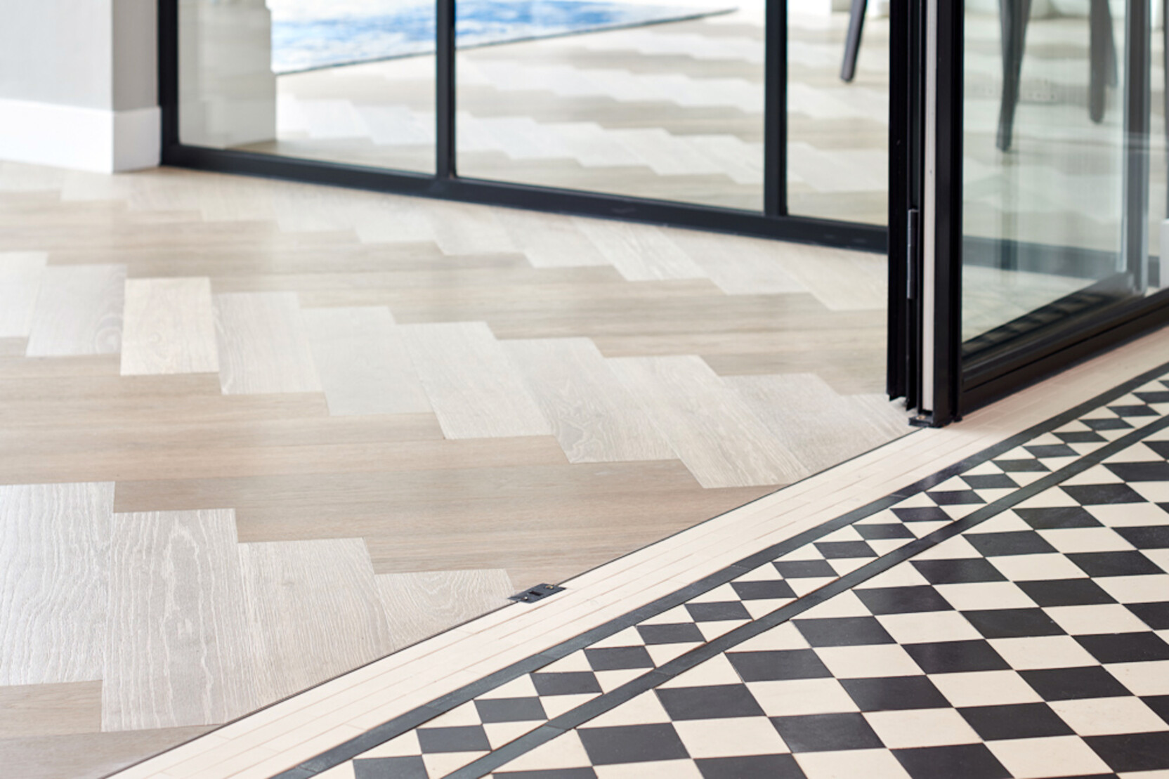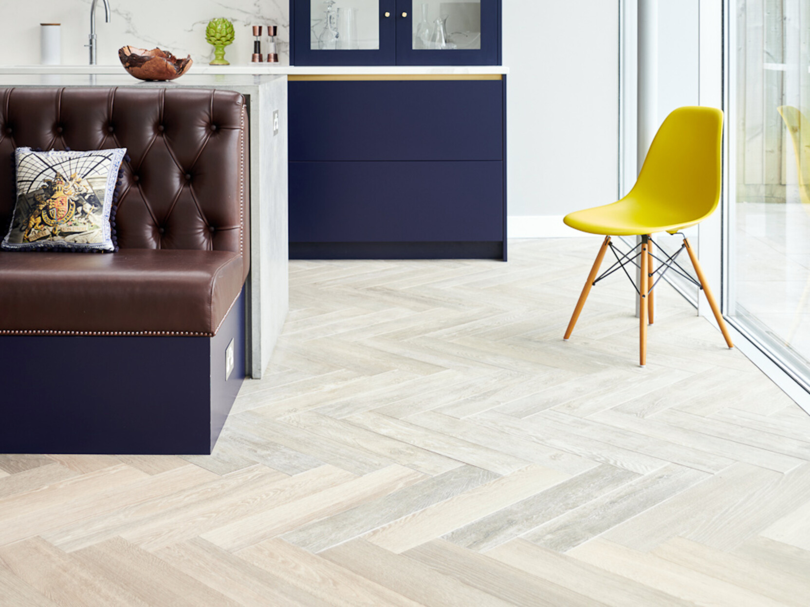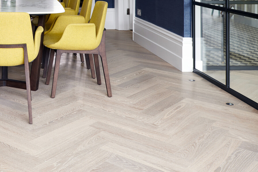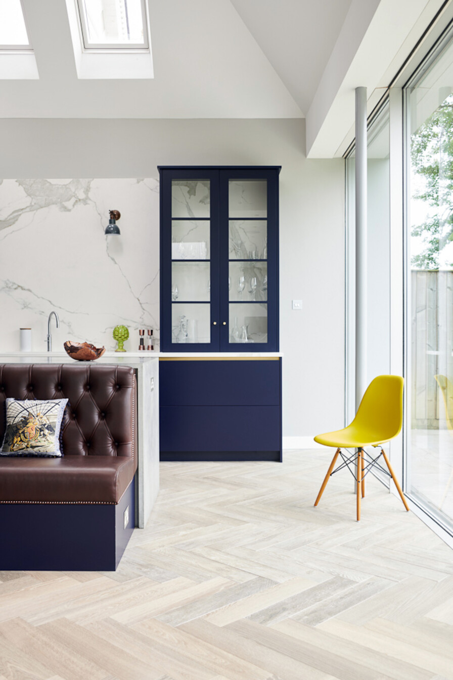 Two tones of prime grade Oak Shingle Herringbone parquet flooring complement the bold colours, high skirting and glass-panelled doors, helping to spread the light throughout the ground floor of this large Victorian house.